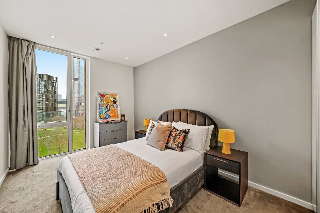This East Village apartment sits within Mirabelle Gardens on the corner of the village and less than five minutes’ walk to Stratford station making the morning commute a breeze. The double bedrooms come complete with built-in wardrobes, a chest of draws and side-tables. While kitchens are fully integrated with appliances including a multi-functional oven and induction hob. A private balcony connects the open plan kitchen and living area to the great outdoors. Hyperoptic Wi-Fi is included in the rent, though residents do have the option to change provider should they wish