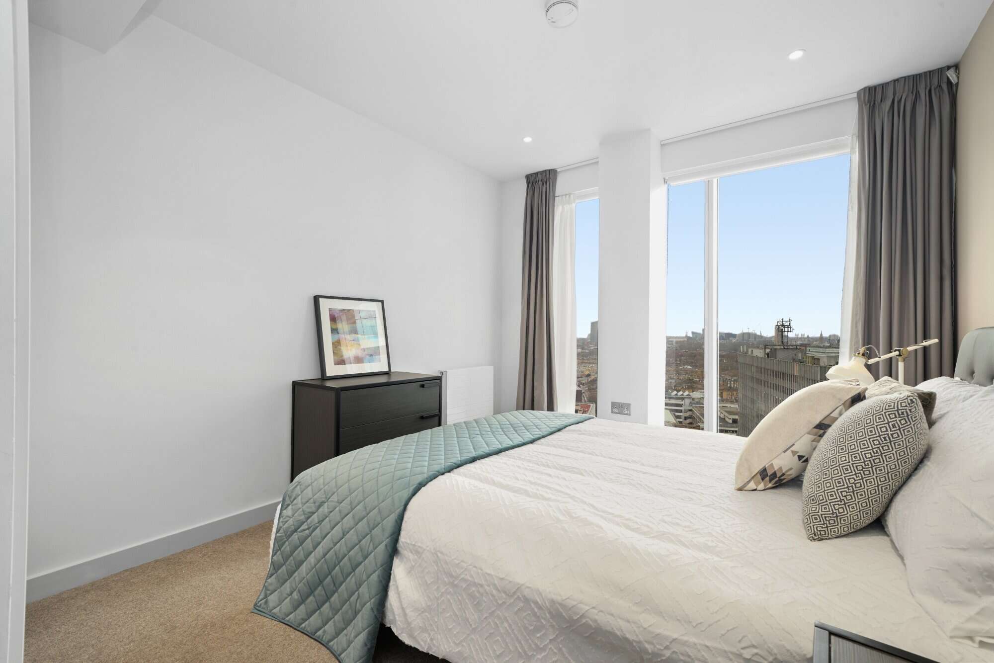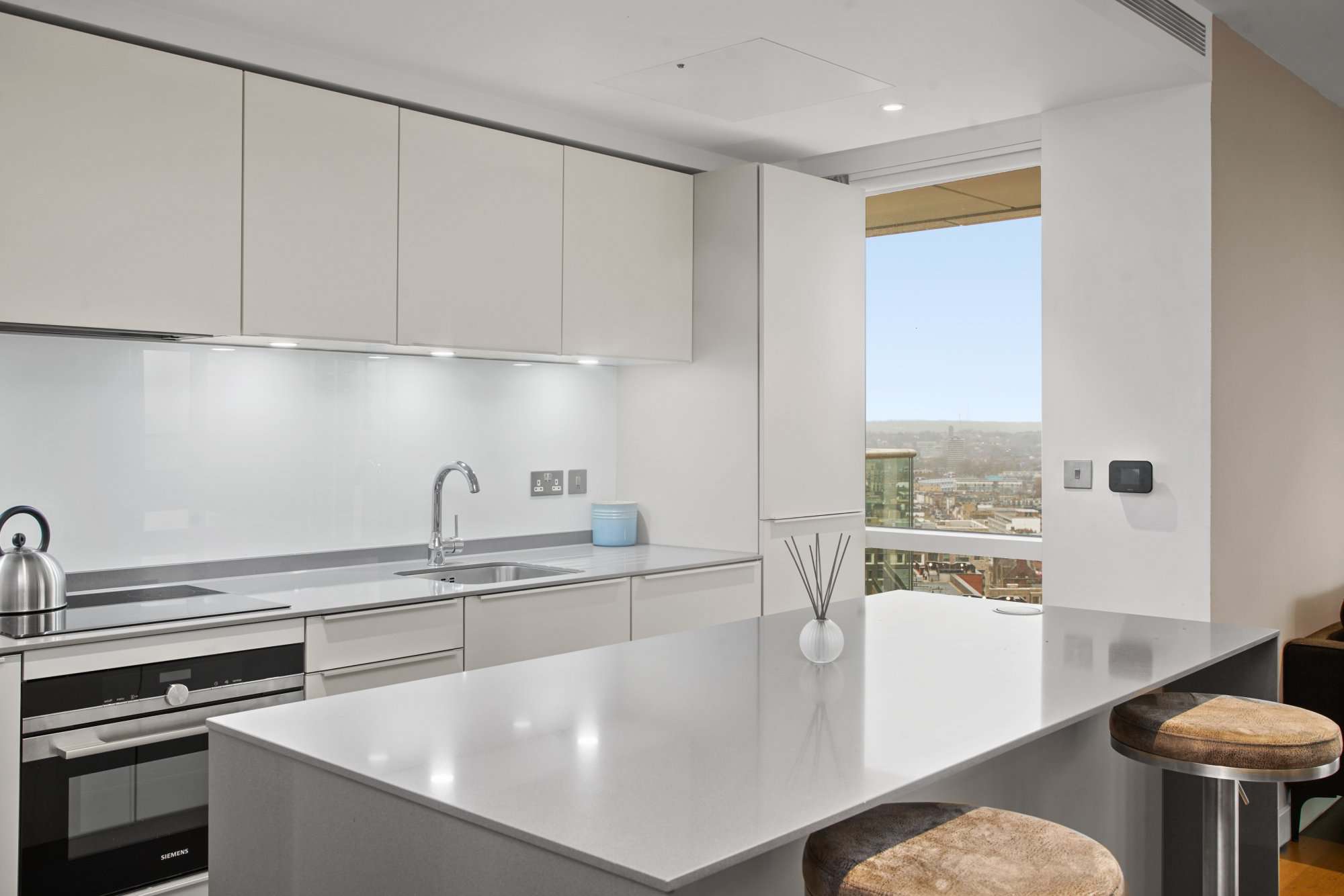 This spacious apartment features an open-plan living area for the kitchen, lounge and dining spaces, with the addition of a large balcony where you can take in some of the best views across London.