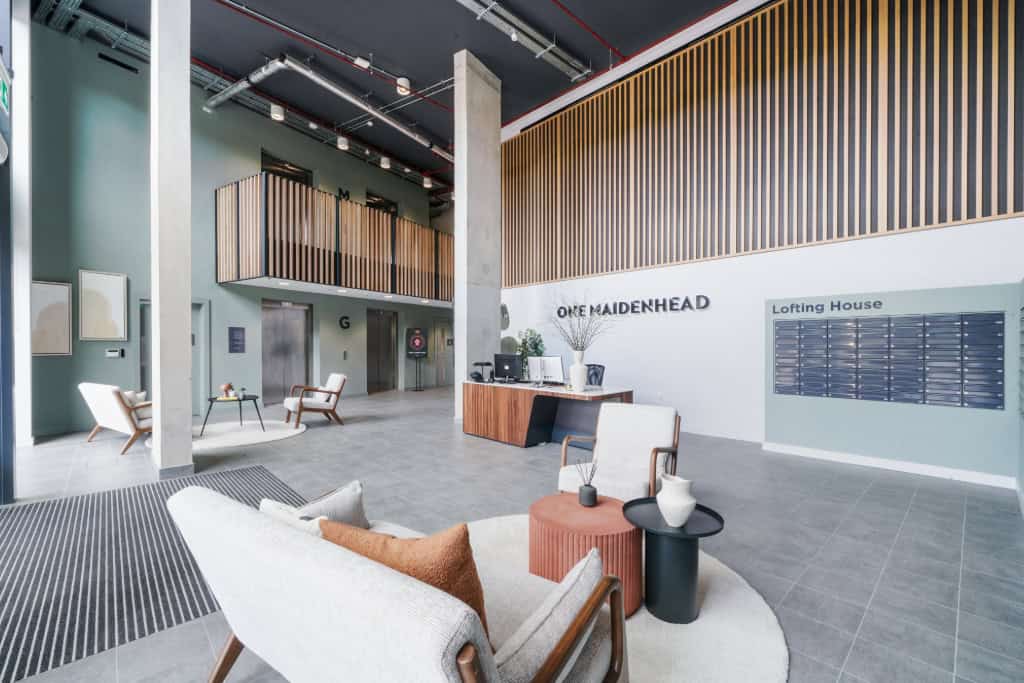 One Maidenhead’s shared spaces / The Living Room amenity space will become an extension of your home where you can both work and relax. Zone in and elevate your work from home backdrop in the co-working area or zone out in the bright open plan resident lounge, dotted with sofas and armchairs.