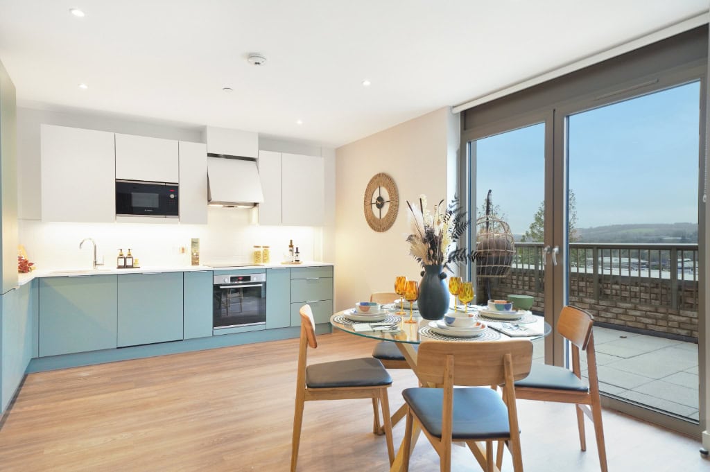 This spacious apartment at The Oakgate features an open-plan living area for the kitchen, lounge and dining spaces. The integrated kitchen is fitted out with Bosch appliances including an oven, an induction hob, dishwasher, built-in microwave and comes with plenty of cupboard space.